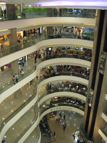 We found the mall the book store is in … and it turns out it is nine stories tall (above left). And packed with people. I have a photo here (above right) which shows a few of them going up and down the escalators.